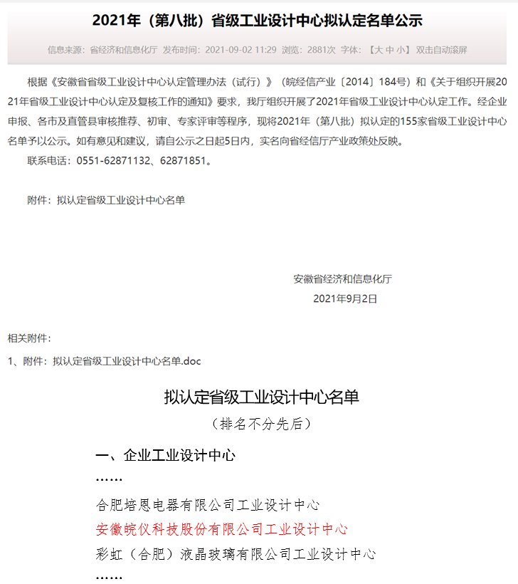 近日,安徽省经济和信息化厅公示了2021年省级工业设计中心认定名单,皖仪科技工业设计中心成功入选。