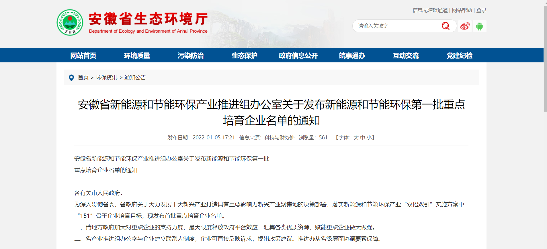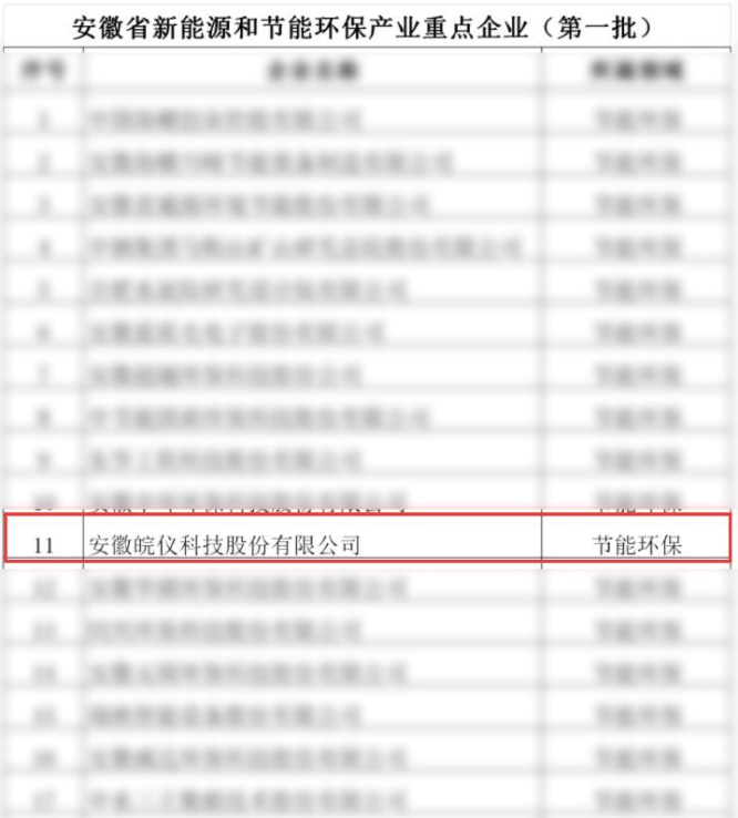 安徽省新能源和节能环保产业推进组办公室近日对外发布通知并公布安徽省新能源和节能环保产业第一批重点企业名单,皖仪科技成功入选。