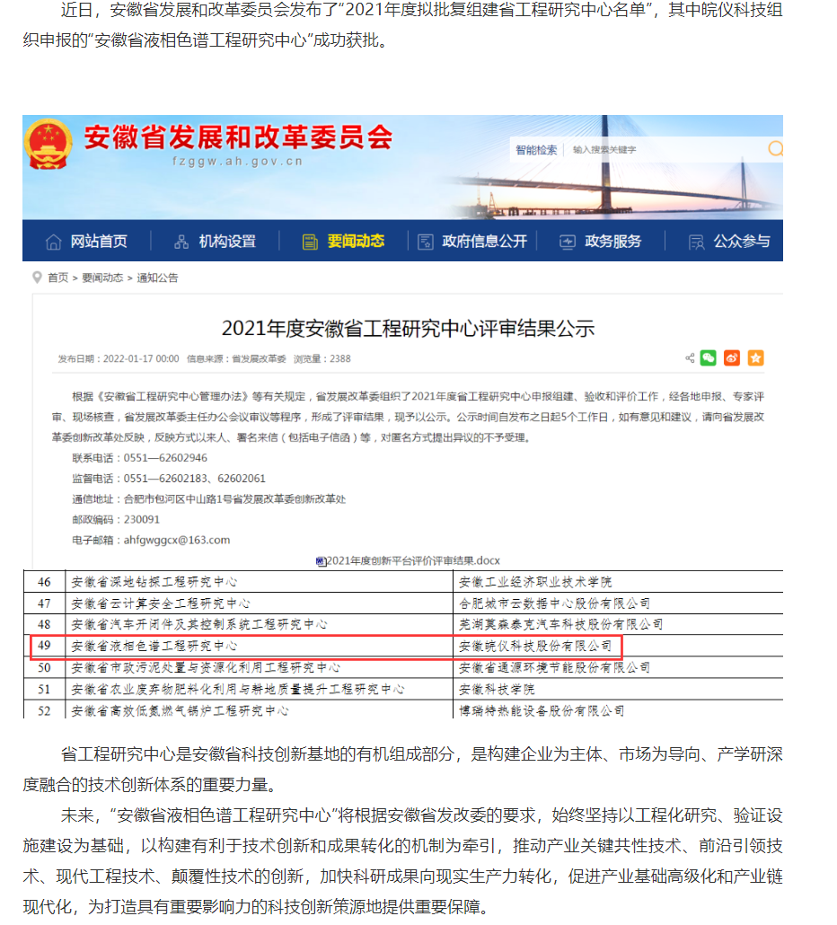 皖仪科技新增省级创新平台 “安徽省液相色谱工程研究中心”