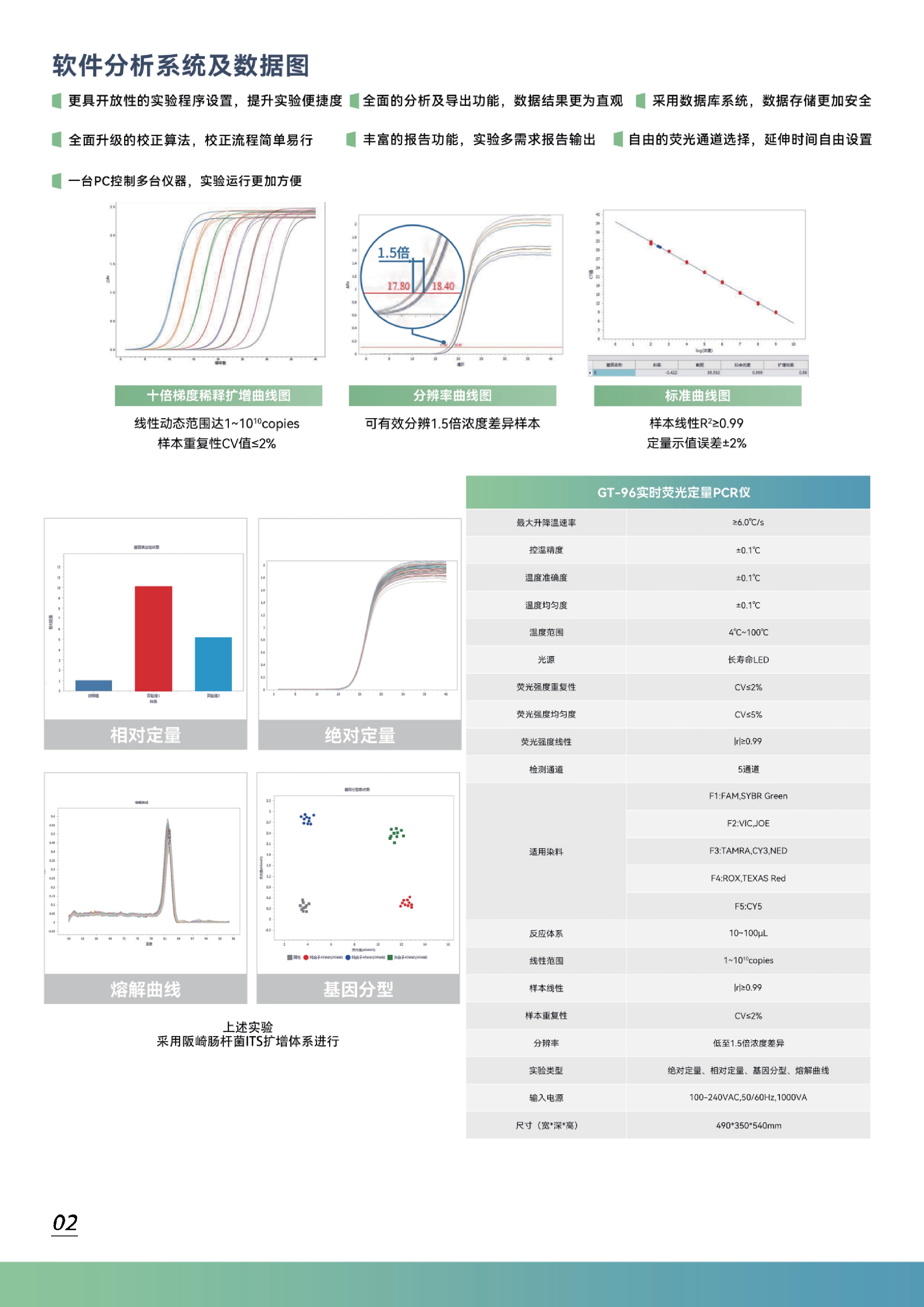 1、定性和定量分析:荧光定量PCR仪能够准确地对目标核酸进行定性和定量分析,广泛应用于基因检测、病原体定量测定等领域。
