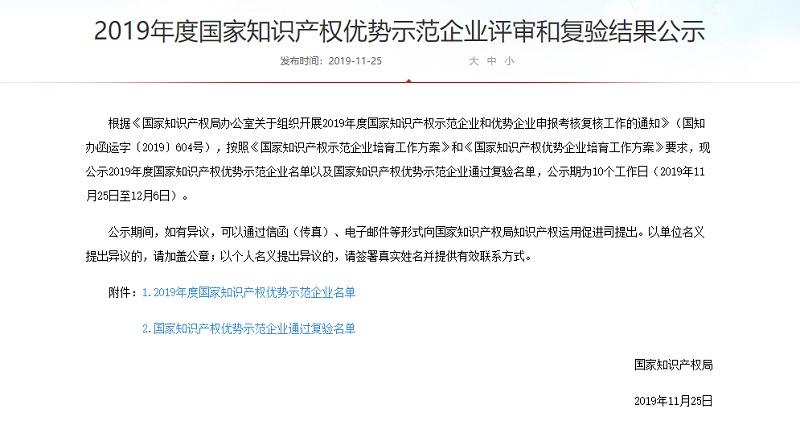 近日,国家知识产权局网站发布最新通知,公示2019年度国家知识产权优势示范企业名单。尊龙凯时科技股份有限公司被安徽省知识产权局推选为2019年度国家知识产权优势企业,经过层层筛选和严格评审,最终成功入选,名单正式在国家知识产权局官网公示。