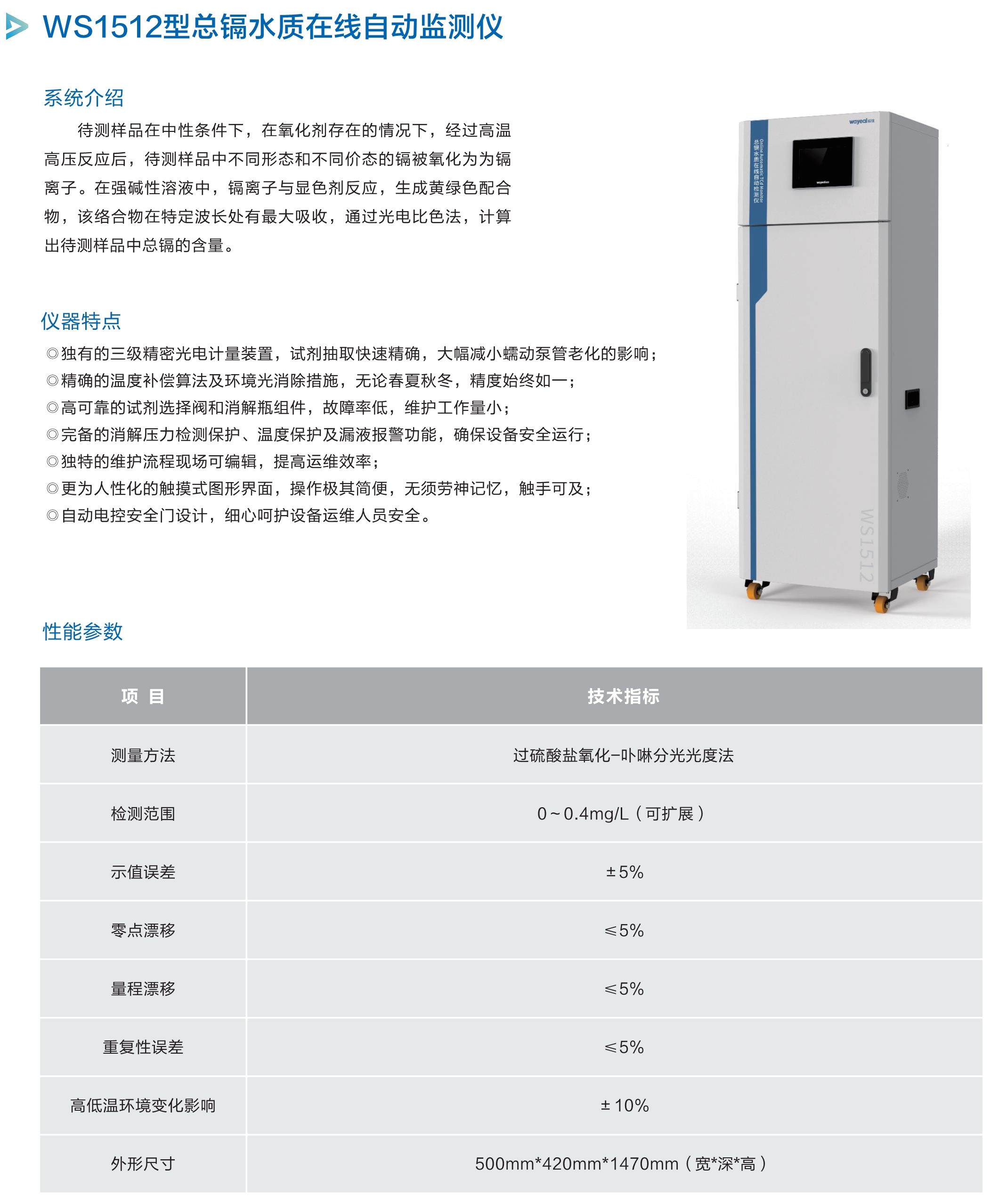 待测样品在中性条件下,在氧化剂存在的情况下,经过高温高压反应后,待测样品中不同形态和不同价态的镉被氧化为为镉离子。在强碱性溶液中,镉离子与显色剂反应,生成黄绿色配合物,该络合物在特定波长处有最大吸收,通过光电比色法,计算出待测样品中总镉的含量。