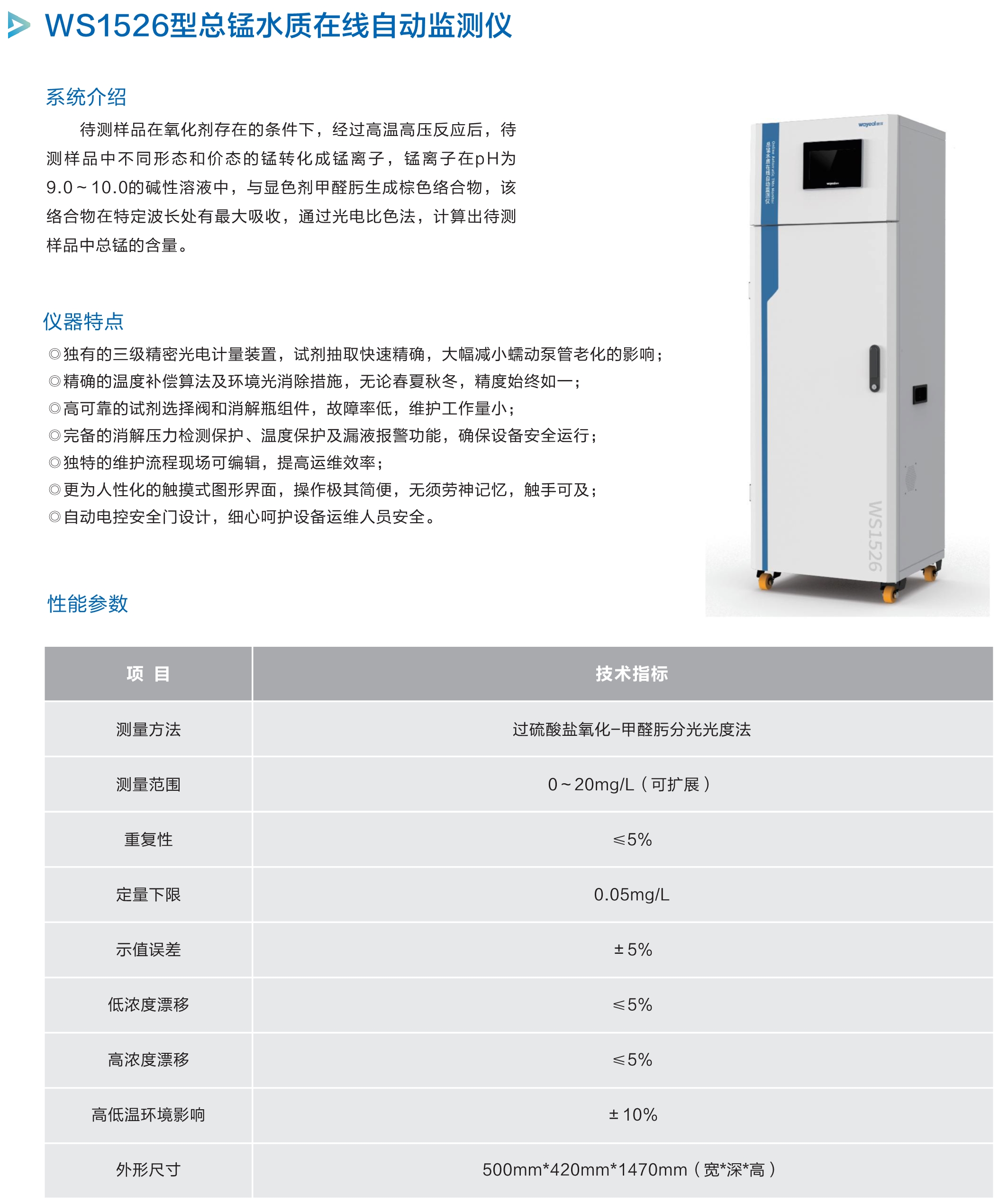 待测样品在氧化剂存在的条件下,经过高温高压反应后,待测样品中不同形态和价态的锰转化成锰离子,锰离子在pH为9.0~10.0的碱性溶液中,与显色剂甲醛肟生成棕色络合物,该络合物在特定波长处有最大吸收,通过光电比色法,计算出待测样品中总锰的含量。