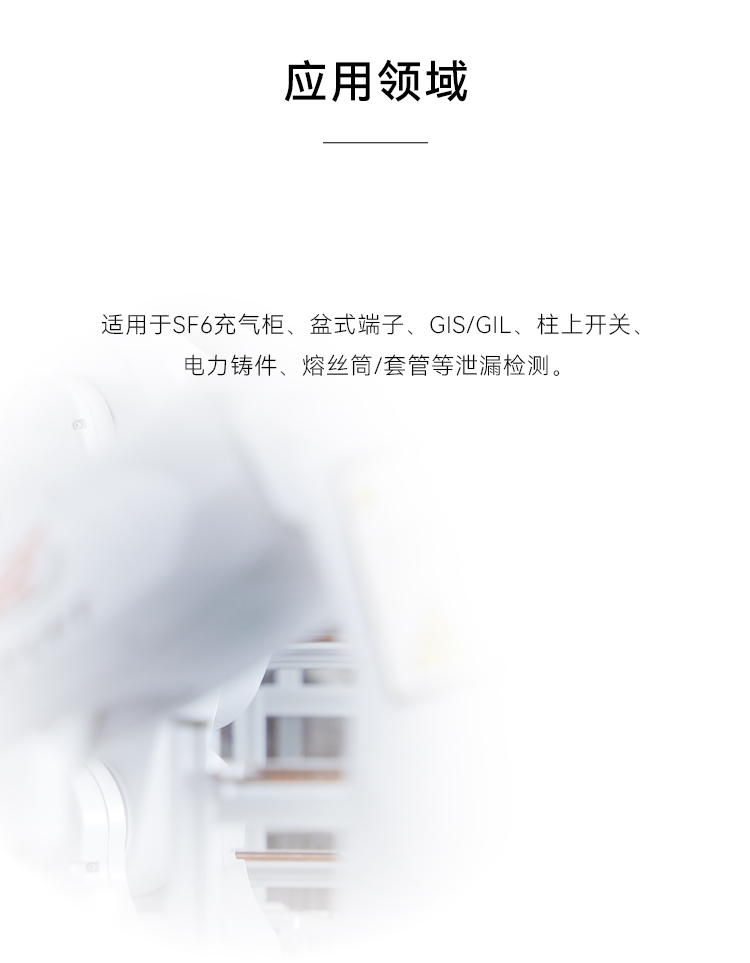 适用于SF6充气柜、盆式端子、GIS/GIL、柱上开关、电力铸件、熔丝筒/套管等泄漏检测。